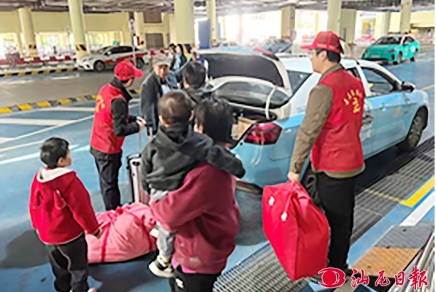志愿者在高鐵站內(nèi)幫助乘客搬放行李。 市委社會(huì)工作部供圖