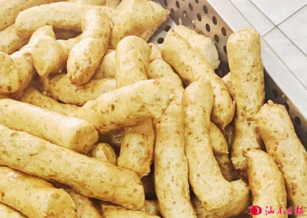 他洗凈馬鮫魚后,用刀把內(nèi)臟、魚頭、魚尾切掉,刀從魚的尾部順序而上剖成兩半,剔出魚身魚骨,片出的兩瓣魚肉,馬鮫魚沒有什么小刺,用勺子挖出魚骨和魚皮上的肉肉,非常輕松地把魚肉採(cǎi)出來(lái),放在大盆里;接著,把小肉丁、大地魚脯、味精、鹽、蔥仔、粉、冬菜、南乳醬等調(diào)料混合在魚肉里,進(jìn)行攪合拍打成膠質(zhì)狀,又倒入攪拌機(jī)里攪拌,幾分鐘后,魚漿很快就均勻,很膩的手感就差不多了;然后,店主兩手沾上一點(diǎn)水,左手張開手掌,托著魚漿,右手搓著左手的魚漿搓捏成條狀,放在蒸屜上,同時(shí)講究火候,蒸20分鐘,馬鮫酵熟透了,揭開蒸屜,白霧騰騰,一股香噴噴魚酵味撲鼻而來(lái),頓感心花怒放;制作馬鮫酵最后的一道工序是炸油,鍋中倒入足量食用油,燒至五成熱,放入蒸熟涼干的馬鮫酵,小火慢炸,待其慢慢浮起定型,并呈現(xiàn)金黃色,再轉(zhuǎn)中火,炸至外皮酥脆,撈出來(lái)后瀝干油分,可這種炸馬鮫酵外皮酥脆,肉里軟嫩多汁,帶有淡淡的香氣。一油鼎馬鮫酵軟塌塌、香噴噴的,和顏悅色溢散人間煙火味。