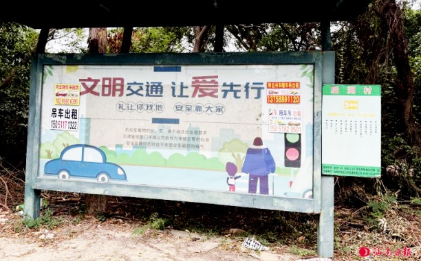 汕尾日?qǐng)?bào)訊(本報(bào)記者 文/圖)近日,記者走訪紅海灣田墘三湖路發(fā)現(xiàn),該區(qū)域公交站牌被各類“牛皮癬”小廣告覆蓋,廣告內(nèi)容多為電話號(hào)碼加簡短文字。原本用于傳播文化的戶外宣傳欄也未能幸免,成為“牛皮鮮”重災(zāi)區(qū)。