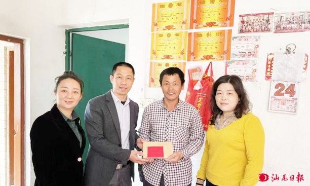 基金會工作人員慰問家庭困難同學(xué)(右二)。